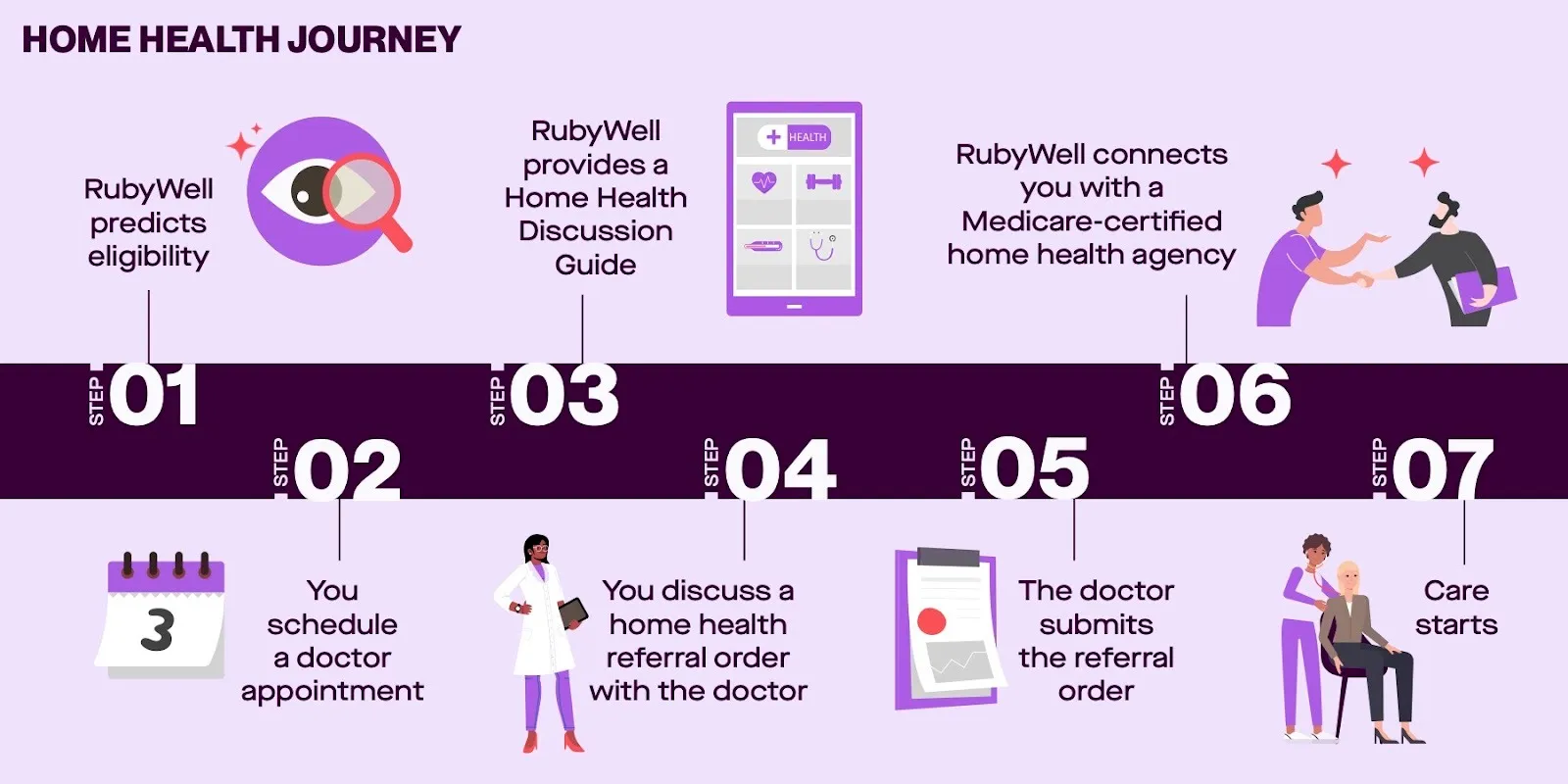 RubyWellTM has developed technology that predicts eligibility for the Medicare home health benefit, then provides the patient with a personalized Home Health Discussion Guide that they can take to their doctor’s appointment. The Discussion Guide lays out all of the patient’s health information that indicates that home health would be appropriate. And it gives the doctor or nurse practitioner the information they need to write a compliant home health order, the first time. It also includes the name and contact info for the partner home health agency the patient will be referred to. It really streamlines the process for all involved so care can start sooner.