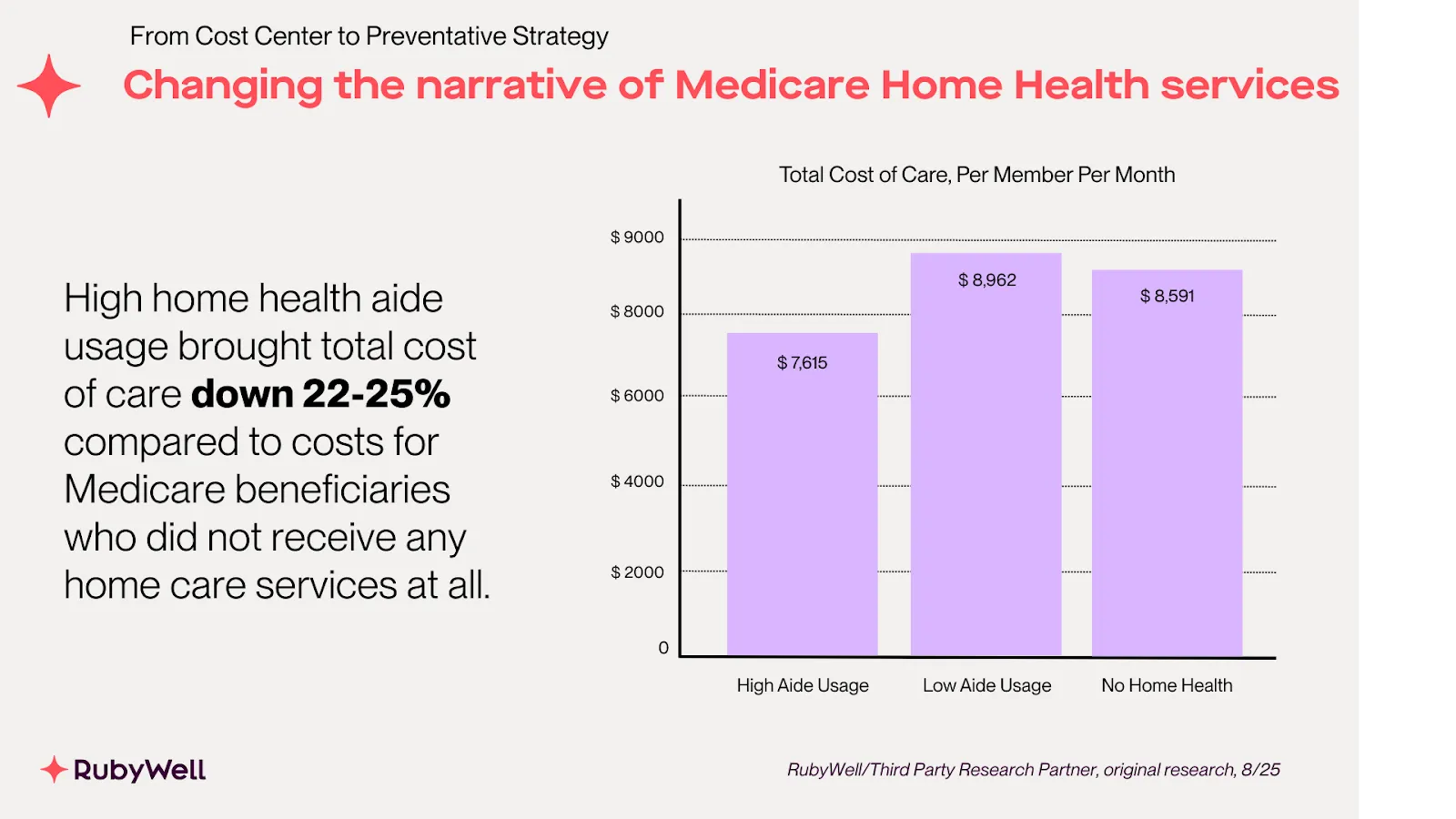 - Medicare saves 22%-25% per member per month on healthcare costs with members who require and receive a high dosage of home health aide services.